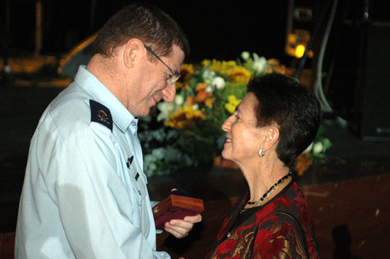 תרצה מקבלת כנפי זהב של אמנון ז"ל ממפקד חיל-האוויר, האלוף אליעזר שקדי.